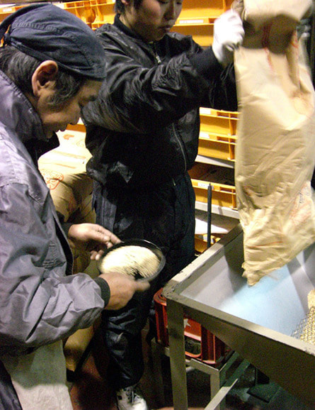 入荷した原料玄米は、検査員が産地・銘柄・等級・数量・外観等を目視で確認します。