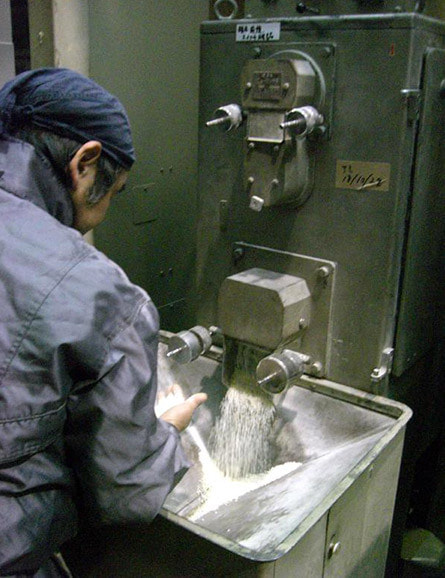 餅加工の場合、通常より精白率を上げて精米します。穀類の表面には多くの雑菌があり、ここで菌数を落とす事も重要です。