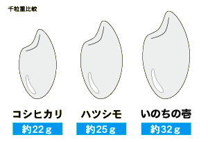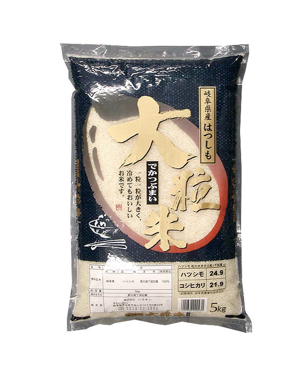 岐阜県産 ハツシモ | とにかくでかつぶ米! 特徴・・・吸水が少なく、かたくずれしにくい 適した料理・・・白米、寿司、丼物、カレーライス、オムライス |